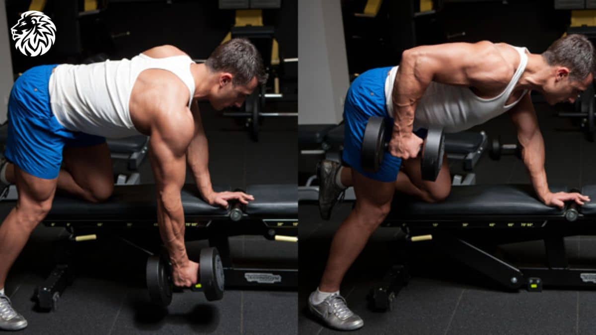 - Place your right knee and right hand on a flat bench. Keep your left foot firmly on the floor and hold a dumbbell in your left hand with a neutral grip (palm facing inward).