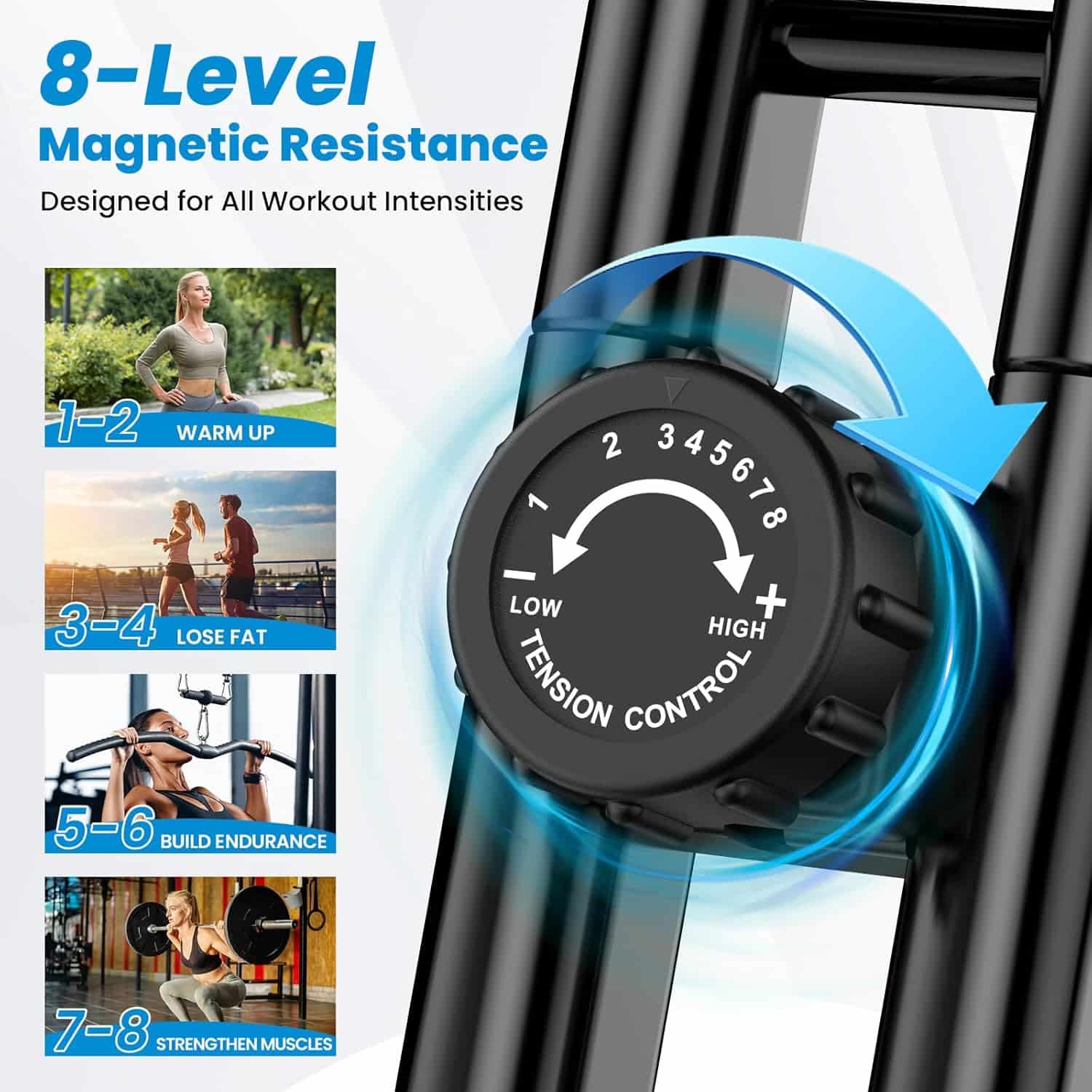 8-Level Magnetic Resistance: Customize your workout from a light warm-up to a fat-burning challenge — all with whisper-quiet operation (<15dB).