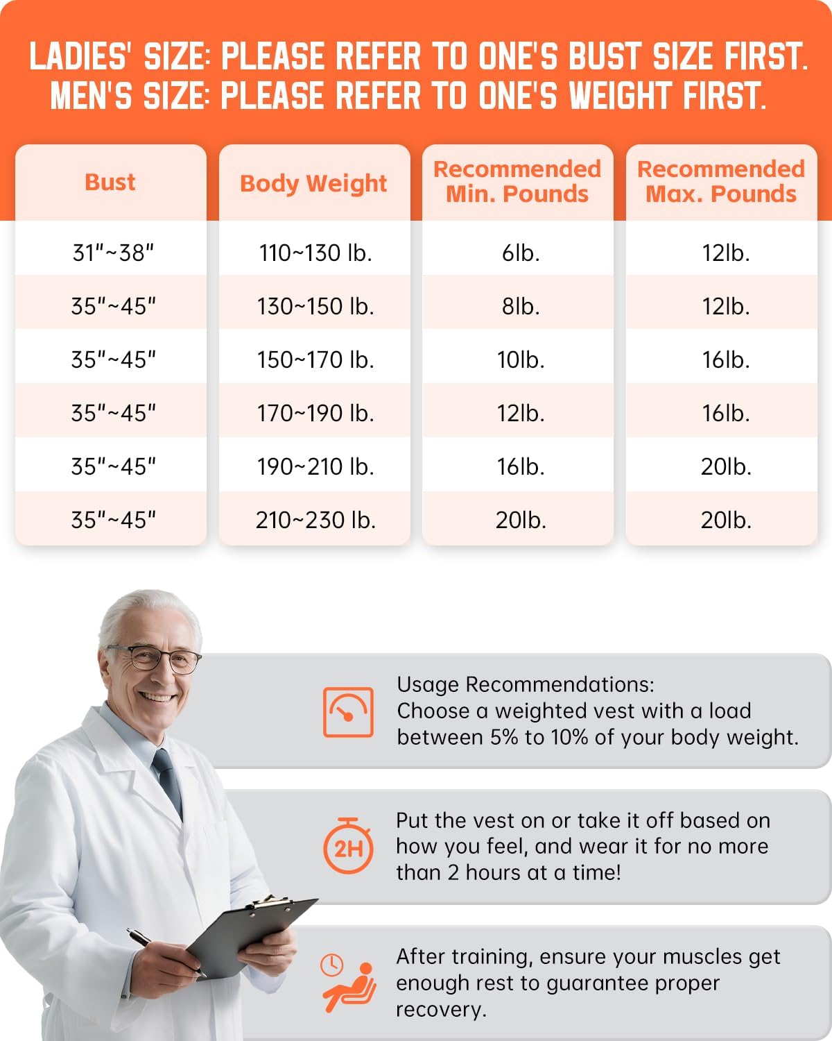 The Renoj Weighted Vest comes in 6lb, 8lb, 10lb, 12lb, 16lb, and 20lb options. You can choose the weight that best matches your fitness level and goals.
